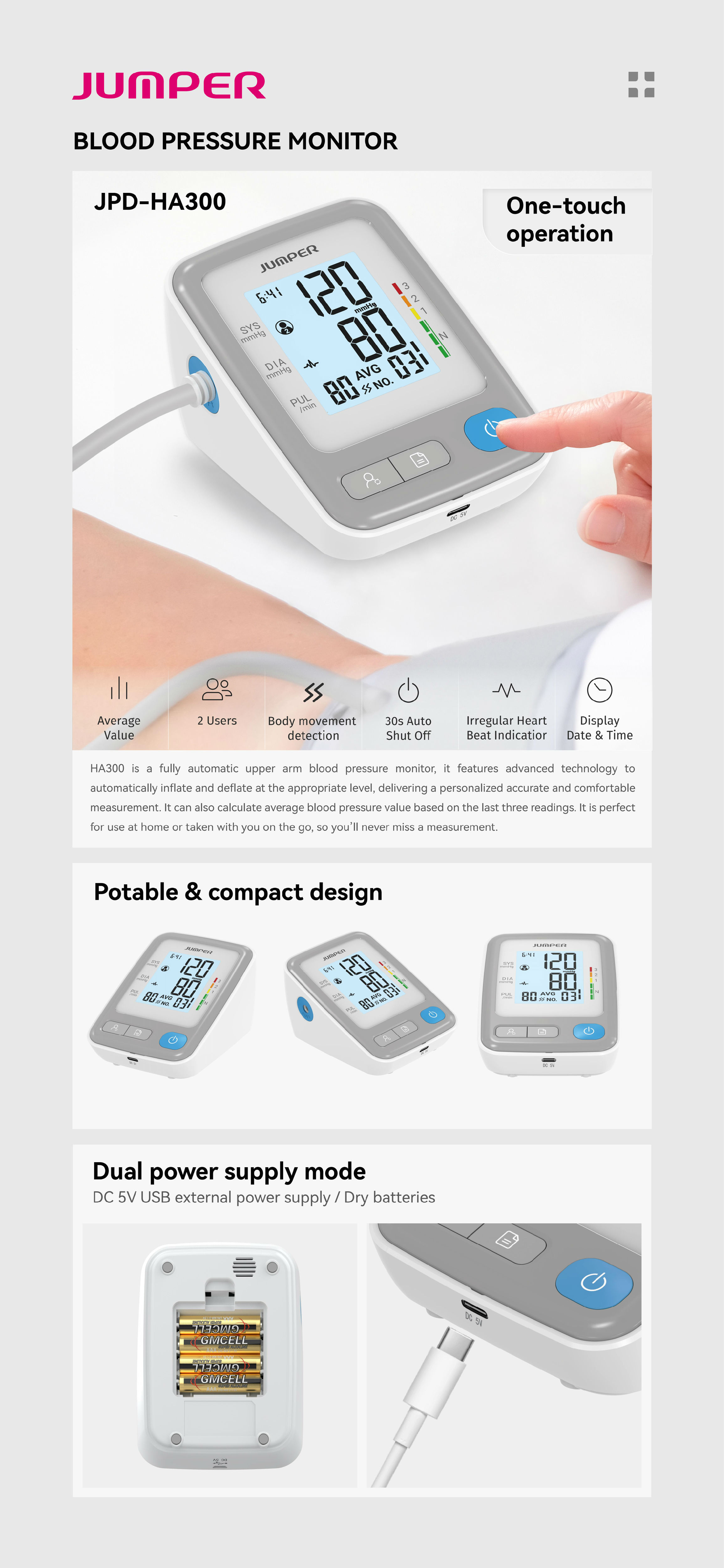 | Power supply | AAA x 4 / USB 5V |
