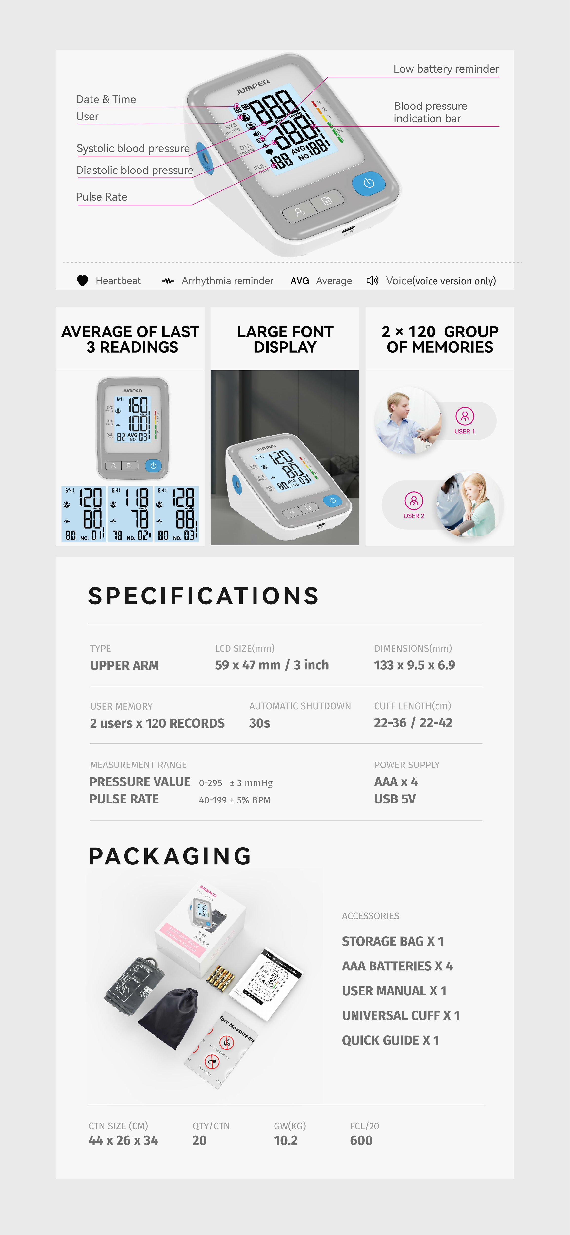 | Measurement Range | Pressure Value: 0-295 ± 3 mmHg Pulse Rate: 40-199 ± 5% BPM |