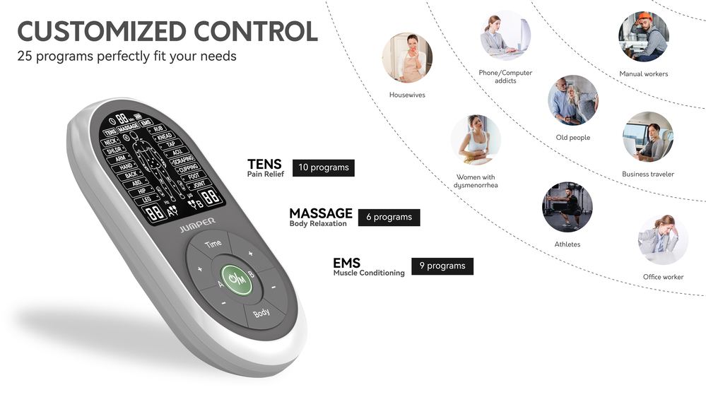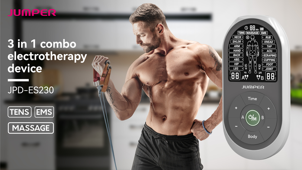 The JPD-ES230 by Jumper is a multi-functional, portable electrotherapy unit combining three therapies in one compact device: