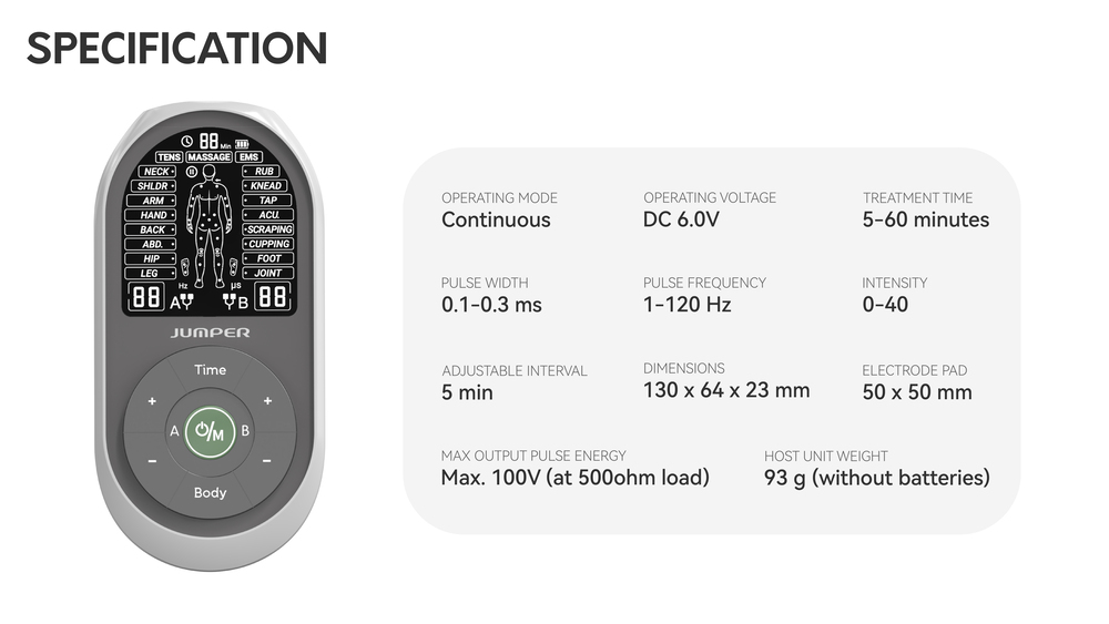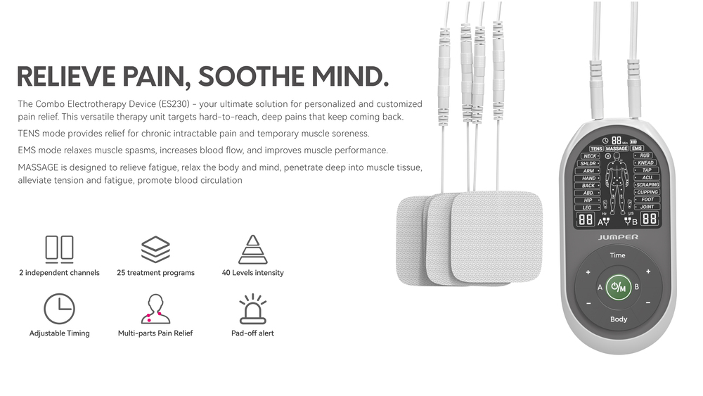 The JPD-ES230 by Jumper is a multi-functional, portable electrotherapy unit combining three therapies in one compact device: